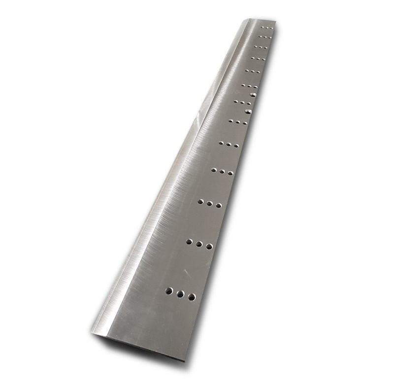 A long, narrow special steel knife installed on a guillotine, driven hydraulically for vertical and swinging cuts.